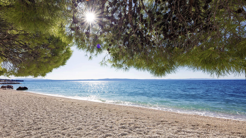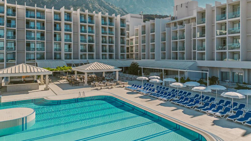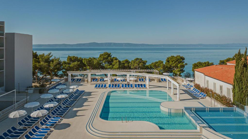 Kombinera avkoppling vid poolen med trevliga strandpromenader - Bluesun Hotel Alga ligger alldeles intill den längsta stranden på Makarska Rivieran där alla kan hitta sin plats under solen eller i skuggan av medelhavets tallar. Vid hotellets rymliga poolområde finns parasoller och solstolar som är gratis för alla hotellgäster.