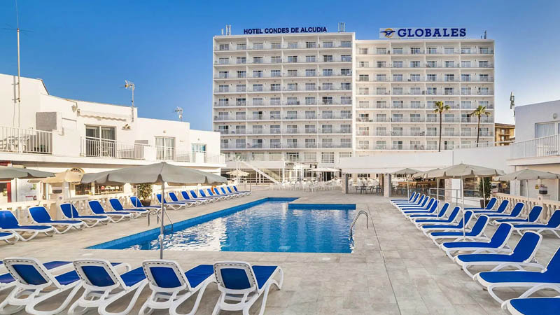 Globales Condes de Alcudia är ett centralt beläget hotell i den populära semesterorten Puerto de Alcudia på norra Mallorca. Här bor vi i ljusa och trevliga rum med blåa detaljer. Från hotellet är det promenadavstånd till Alcudias breda strand och hamnen.